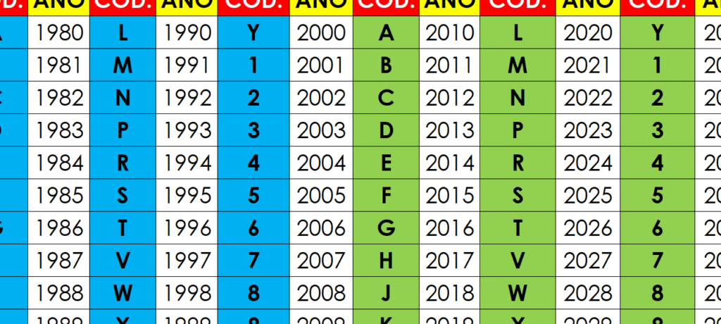 - Letras: La letra A corresponde al año 1980, la letra B al 1981, y así sucesivamente hasta la letra Y que representa el año 2000. La letra Z se utiliza para representar el año 2001 y, a partir de ahí, se vuelve a empezar con la letra A.
